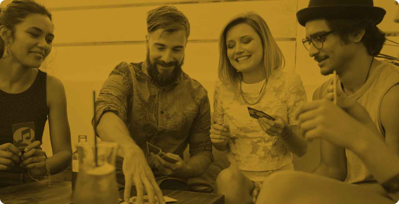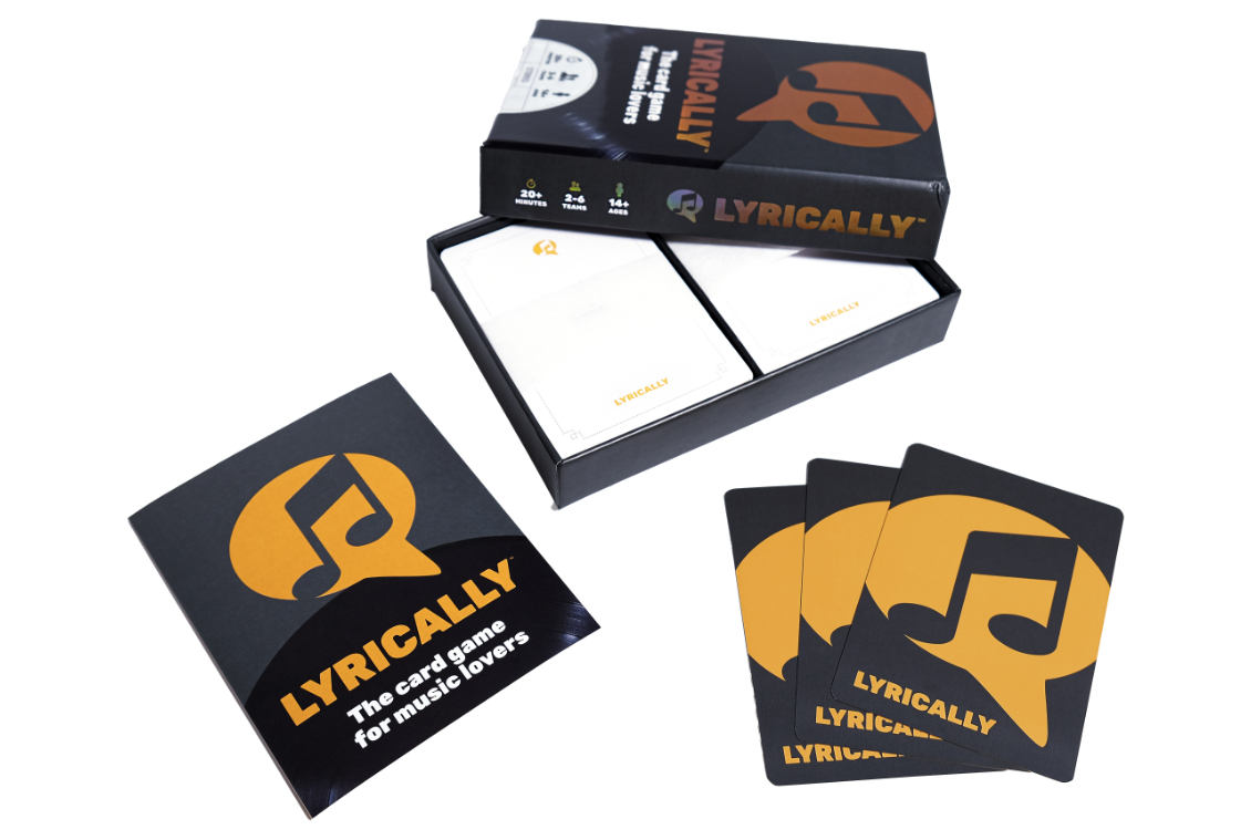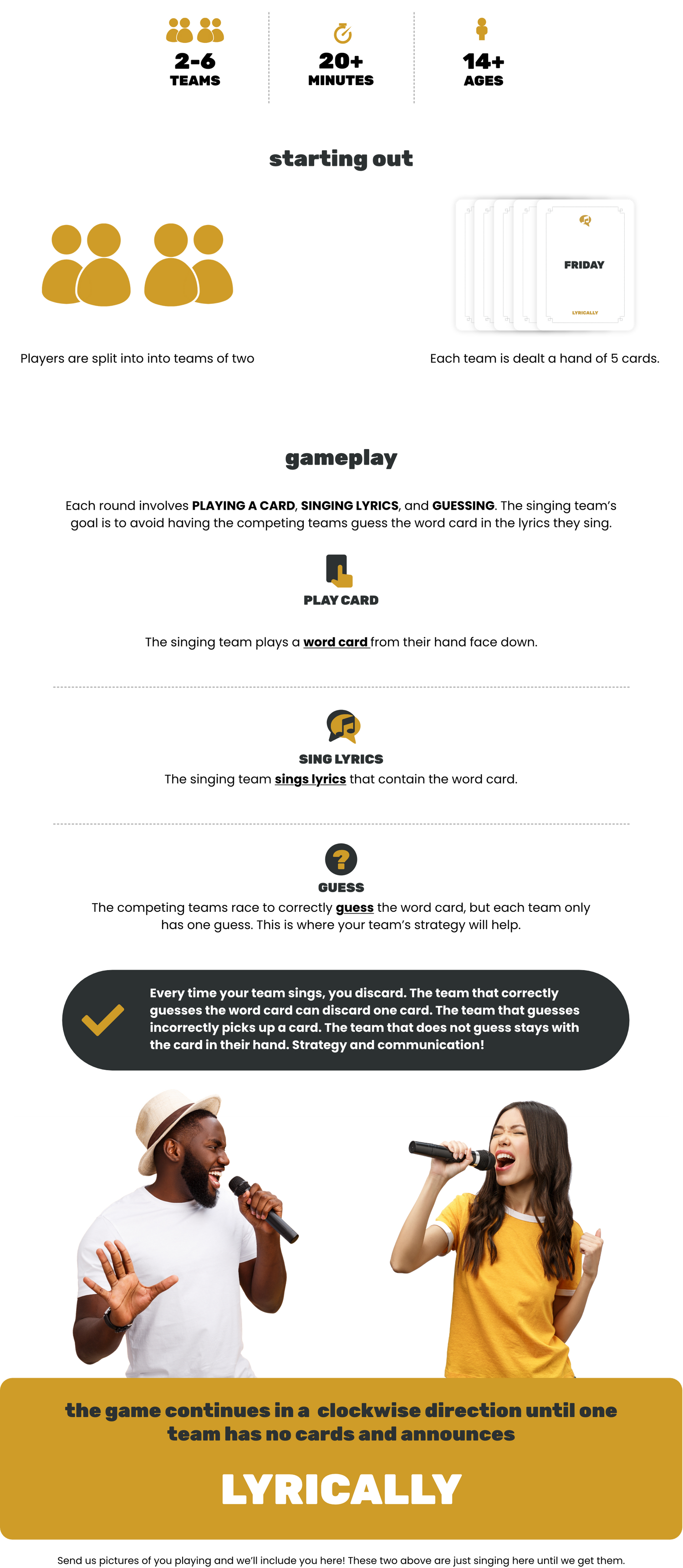 The game is fun, fast and wickedly simple to play! Each round, one team picks a Lyrically word card and sings a song from any genre while the competing team(s) rush to correctly guess the word they are singing. The first team with no cards in their hand wins!